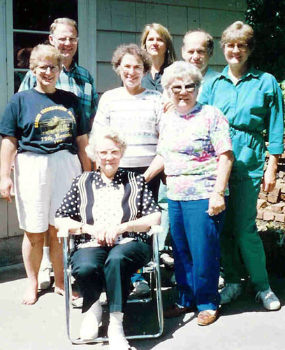 The annual Erdman reunions have been held in early July in conjunction with the parade and "sports day." Here are several generations of the Erdman descendants, 1998. Victor, Ralph, and Oscar Erdman are here - all nephews of Lisa Silberman. Lea Silverton and Elsie Erdman are here too.